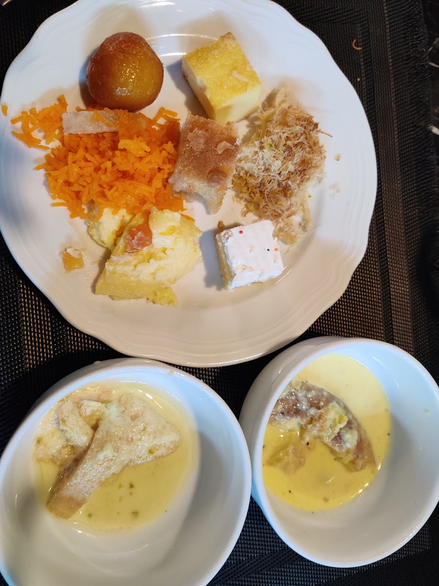 Among the offerings, there’s a gentle playfulness in the range— from rich, slow-cooked meats to delicate sushi, and from fragrant Thai soups to refreshing seasonal fruits. This blend encourages moments of discovery, whether you find yourself drawn to the hearty warmth of the nihari or the fresh zest of the assorted rolls. The dessert selection, though simple, completes the meal with subtle sweetness and nostalgia.